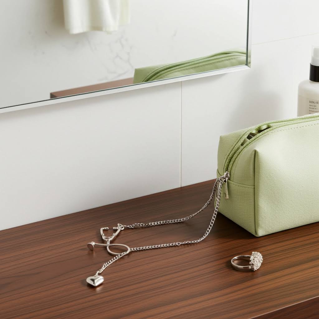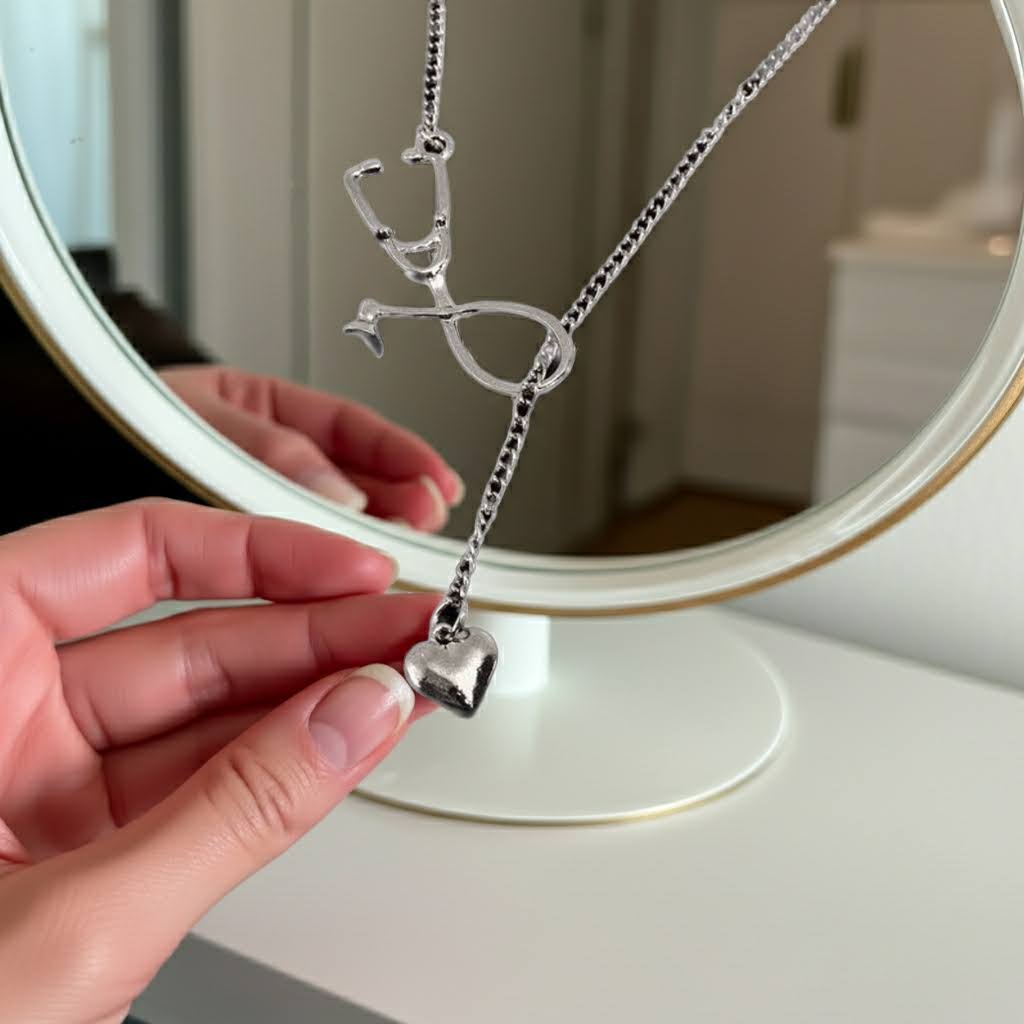 Dije en forma de estetoscopio con cadenita unida. En un extremo de la cadenita encontramos al estetoscopio y en el otro extremo un corazón en 3D.