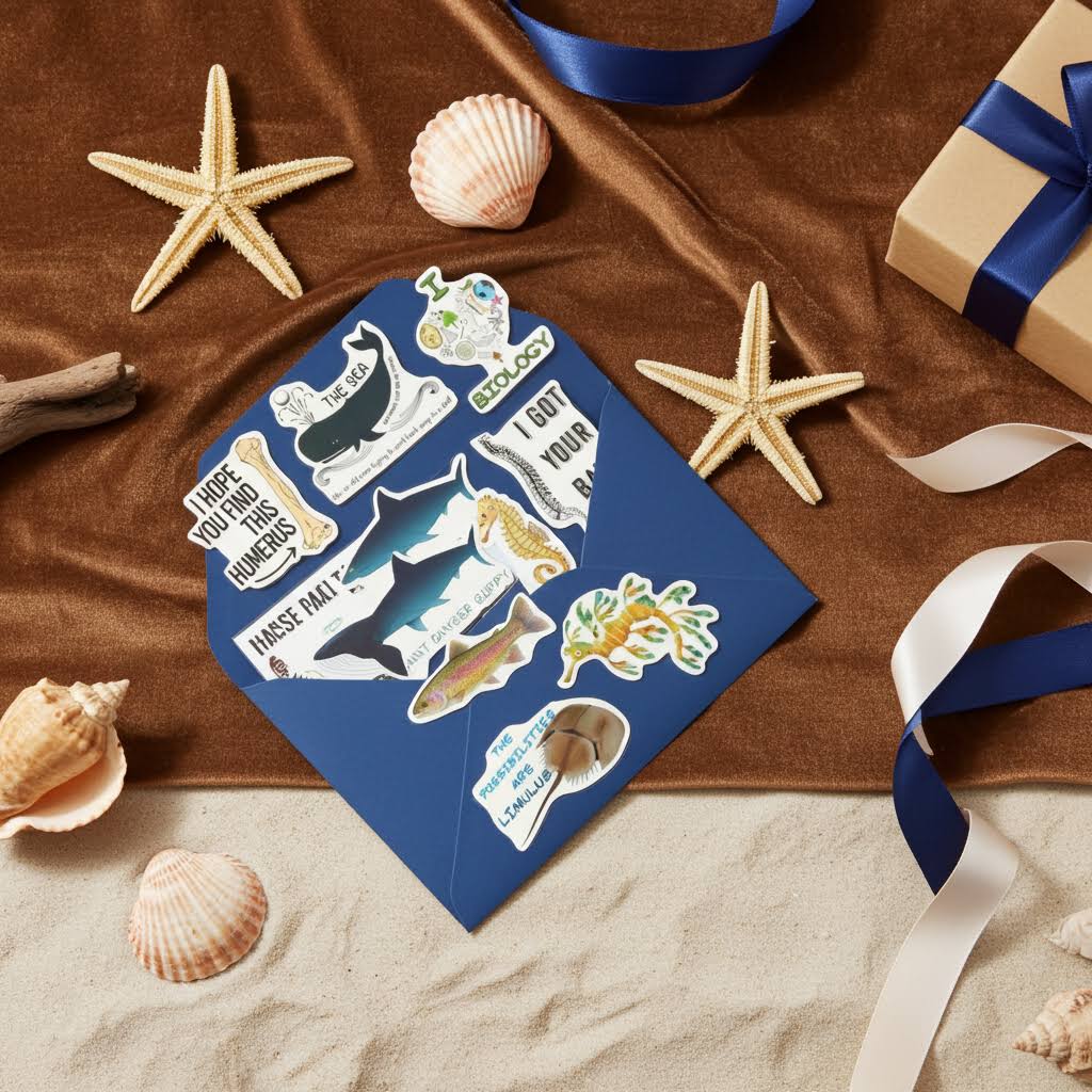 Pack de 10 stickers autoadhesivos con motivos relacionados a la biología marina.