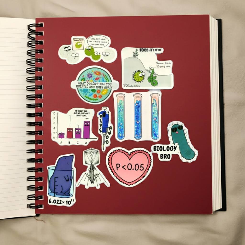 Pack de 10 stickers autoadhesivos con motivos relacionados al laboratorio científico.